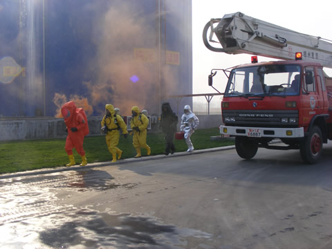 霎那间,一群“天兵”从四面八方奔来。专业人员现场查看险情后,将泄漏情况向指挥人员做紧急汇报,并启动公司危险化学品应急灭火救援预案,闻讯赶来的消防官兵迅速检查堵漏,并通过移动遥控水炮远距离灭火。在消防队的掩护下,一队穿着隔离衣的医生抬着担架将“晕倒”的员工救离现场,并迅速拿出医疗器械现场施救。不远处,拉起了一条红色的隔离带,警戒人员指挥着来往车辆,并紧急疏散往返群众,检测人员对流淌的液体进行监测,并进行处理……。惊心动魄的30分钟后,事故处理完毕,生产恢复正常。